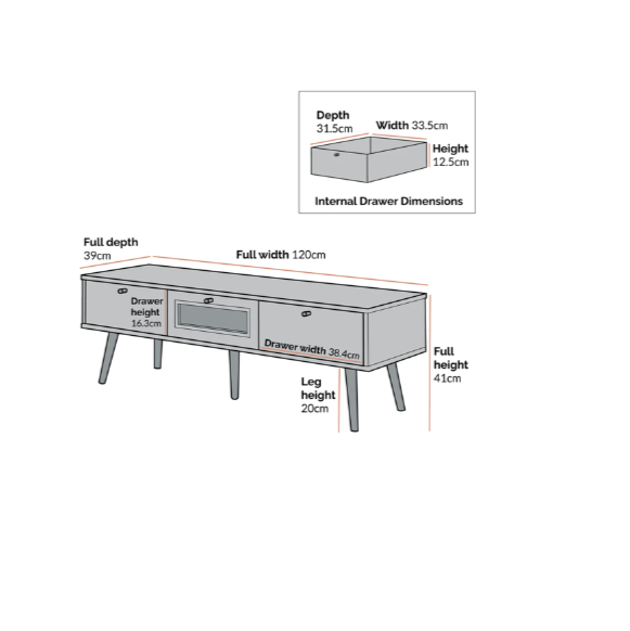 - Dimensions: W 120 x D 39 x H 41 cm.