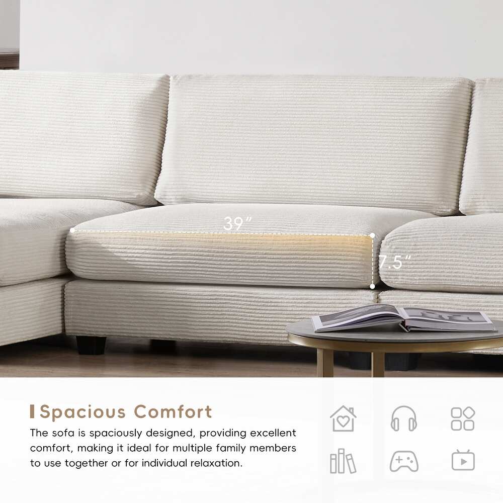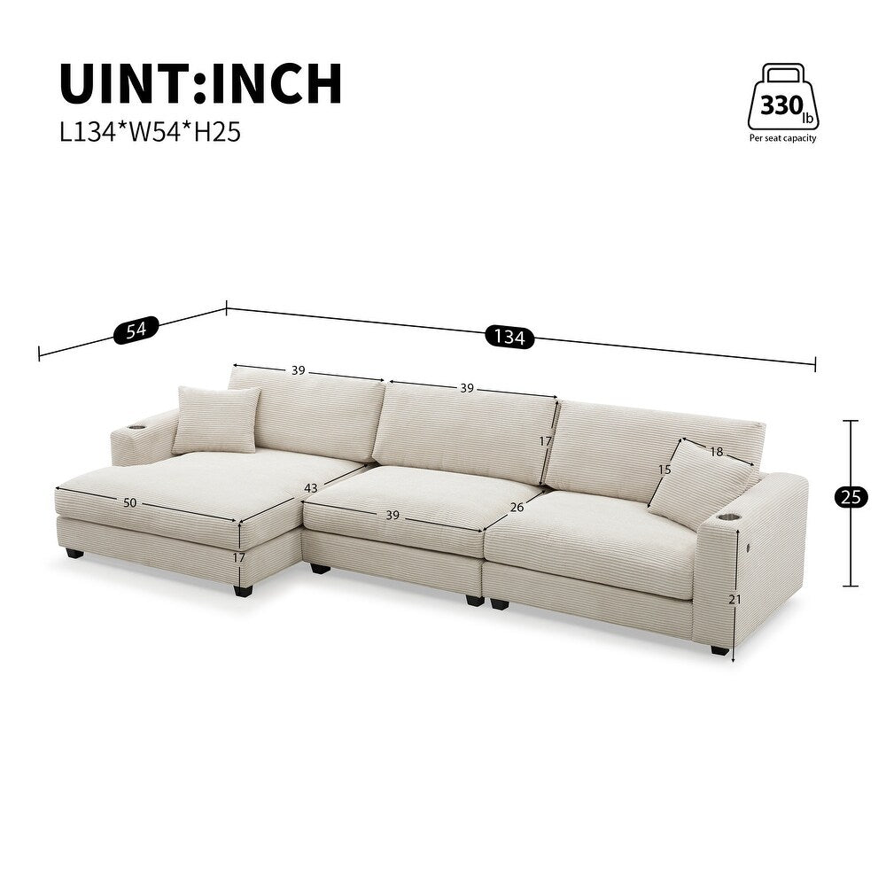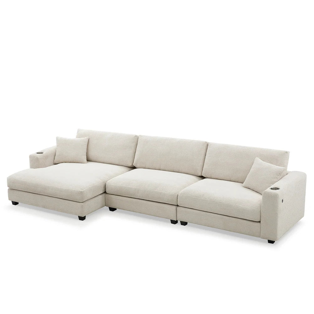 The extra-wide seat and chaise lounge offer luxurious and comfortable seating options with features such as cup holders and USB charging ports. The thick corduroy fabric enhances comfort and beauty, making it a great choice for any living space.