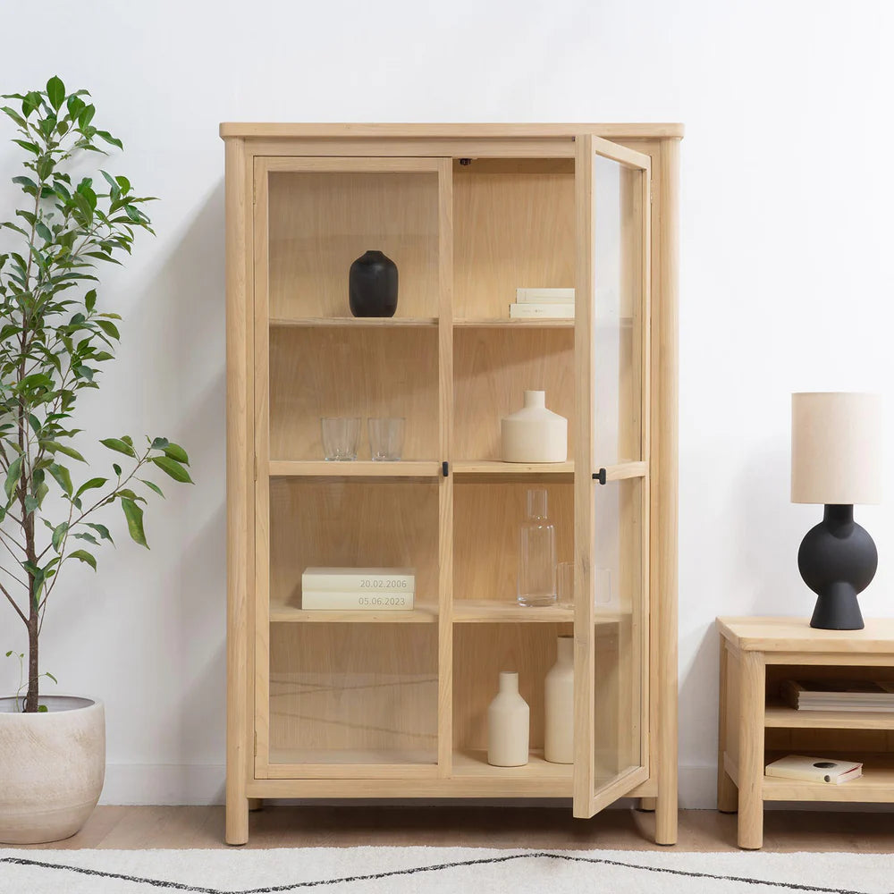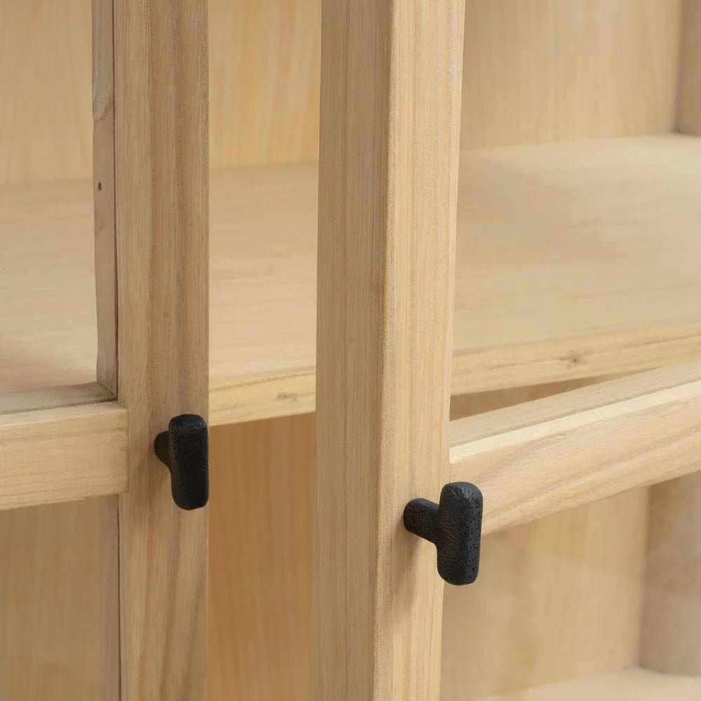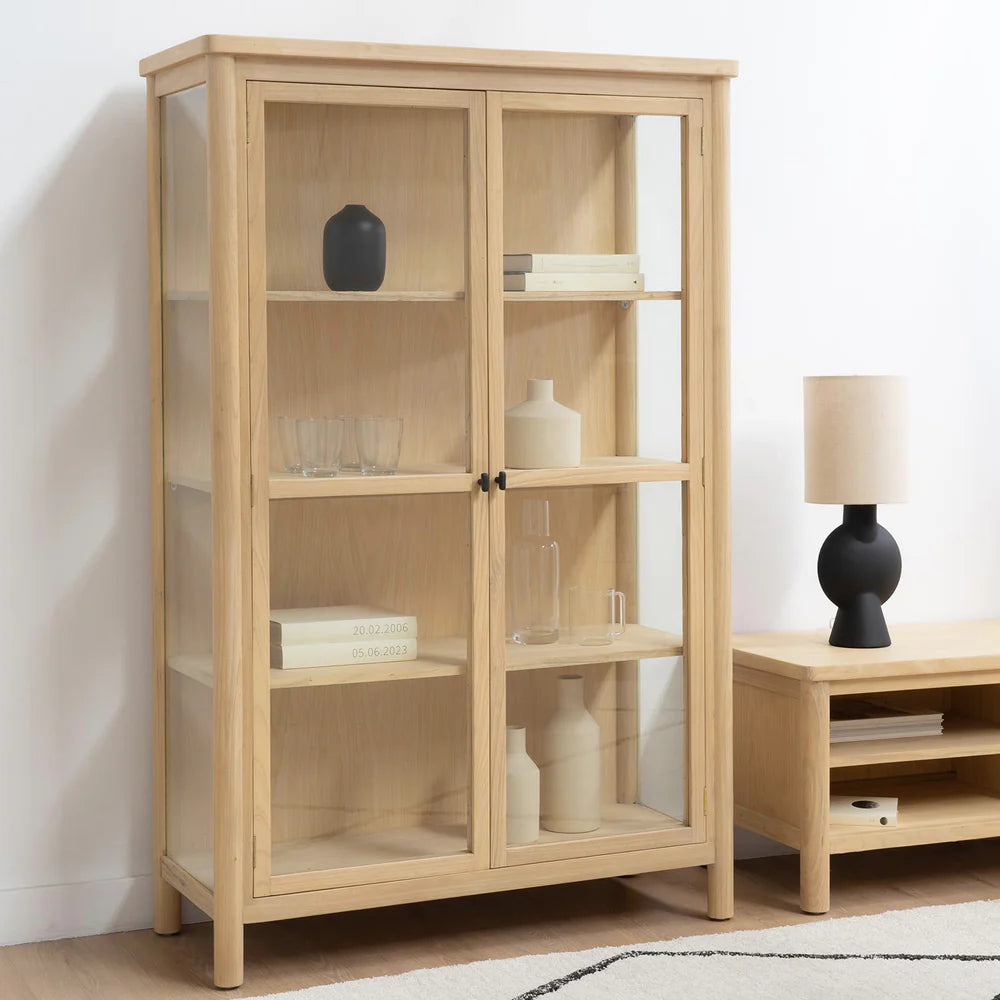 Experience the elegance and spaciousness of the dining room with the Dane Showcase. Made of wood, its glass doors provide a sense of openness. The black iron knobs add a touch of sophistication. Complete the look with the rest of the Dane collection.