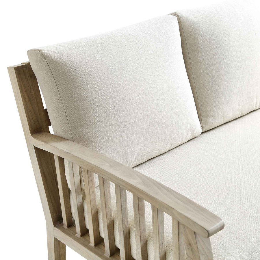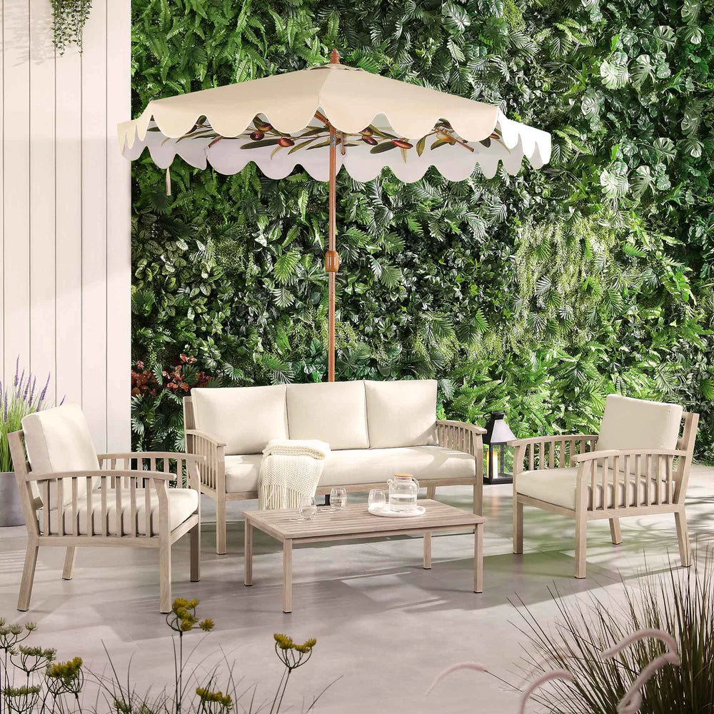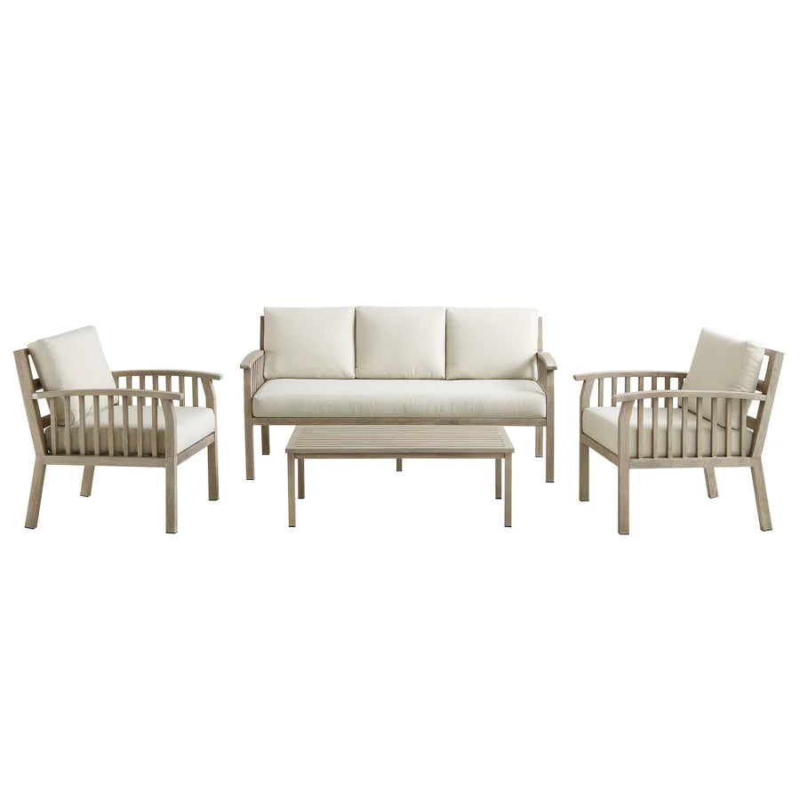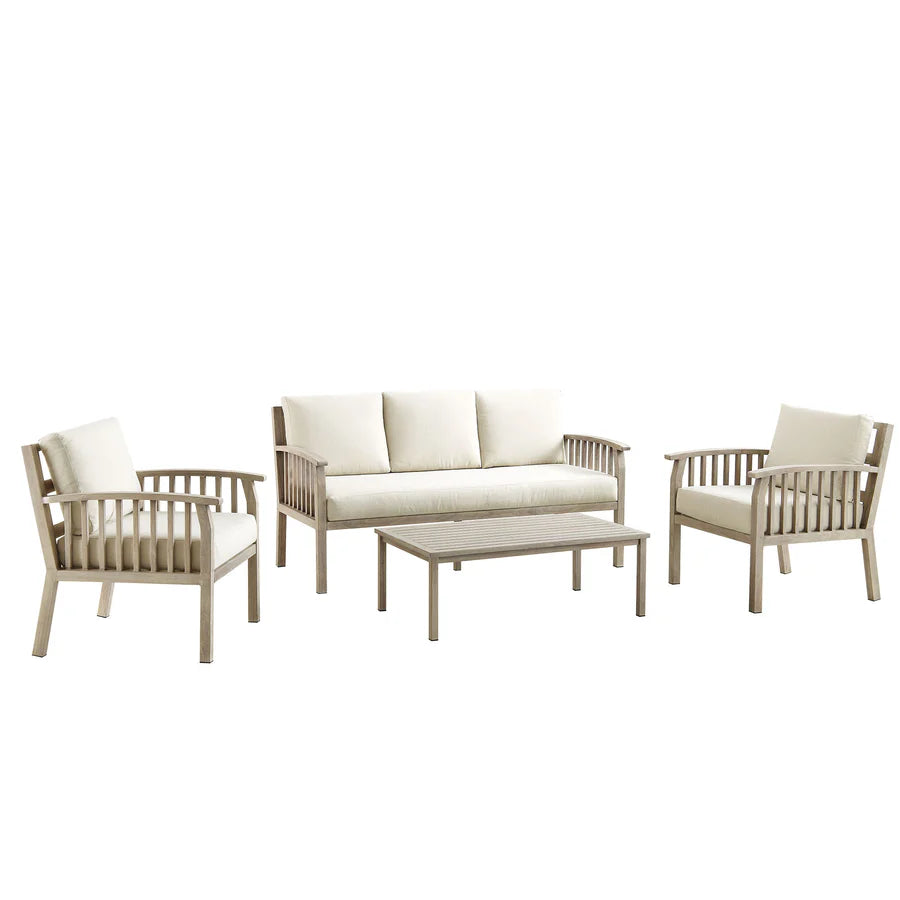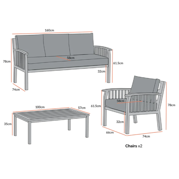 Transform your outdoor space with our rustic Earlswood Corner Sofa Set. The sturdy aluminium frame and sumptuous cushions offer comfortable country-style seating. The elegant slatted design and washed wood effect add timeless charm to your garden. This set includes two double seat sofas, a corner sofa, and a coffee table for ample seating.