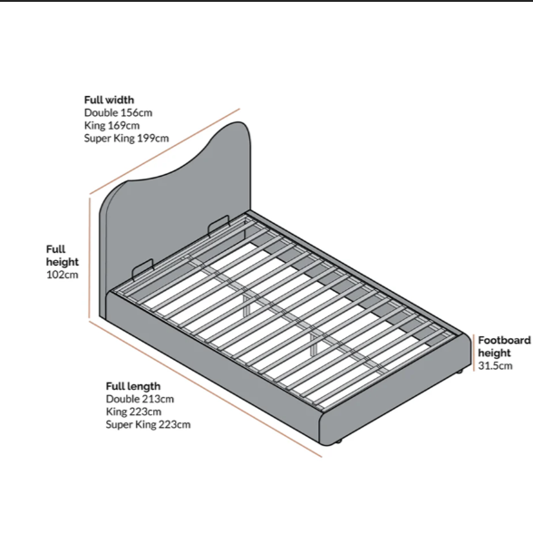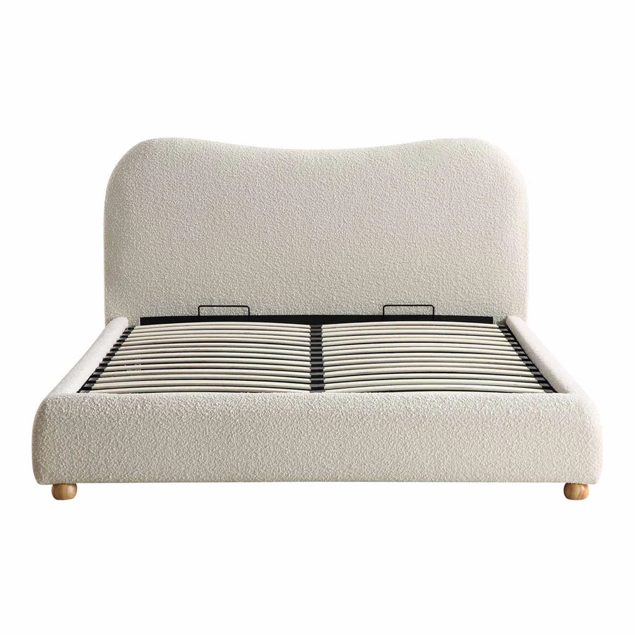 Introducing our Egerie bed, featuring a curved silhouette and sumptuous beige boucle fabric for a chic and cozy place to relax. Four solid wood round legs with a matte finish provide support, while the handcrafted curved headrest makes a statement. The sprung solid wood slatted base and gas lift mechanism for the ottoman add comfort and ease of use.