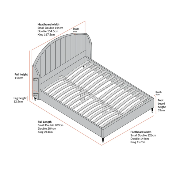 Introducing the Eleanor White Boucle Upholstered Bed Frame! Make a statement with its domed headboard and textured white boucle fabric. The modern chic look is complete with golden color tipped dark wooden legs. Enjoy a comfortable foundation for your mattress with the sprung wooden slatted base. Self-assembly required.