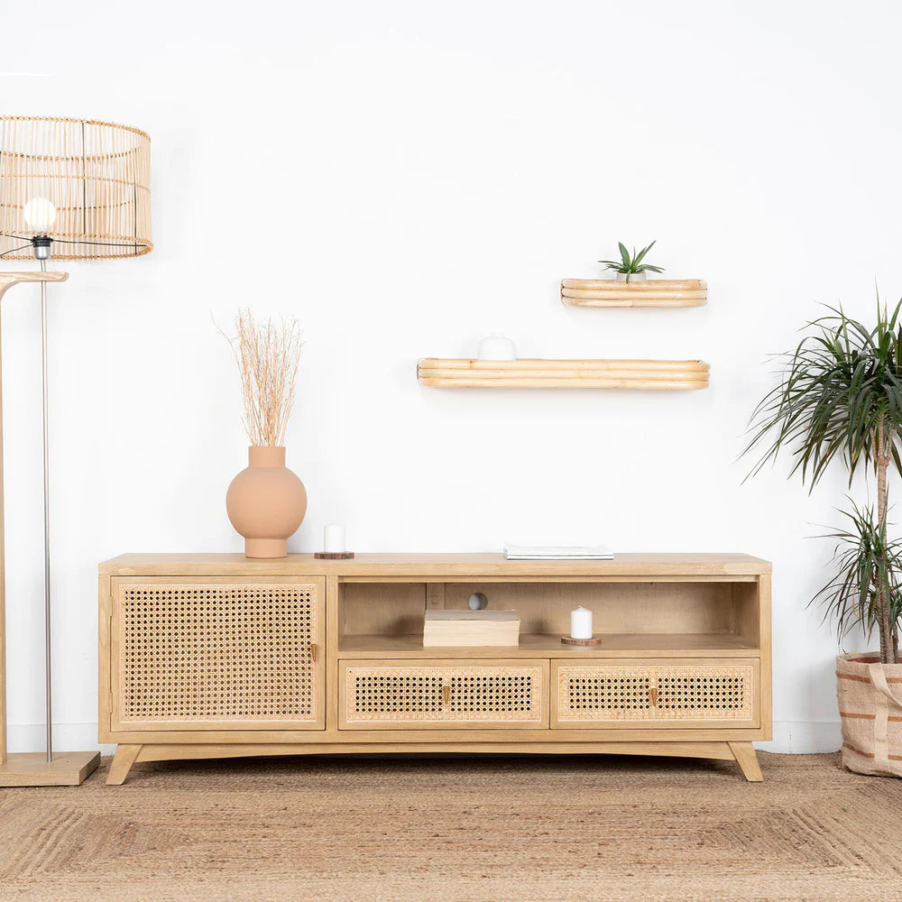 This Gese TV unit is the perfect combination of style and function. Made of wood and natural rattan fibres, it offers a unique and casual look. With a door and two drawers for storage, as well as a cable hole for easy organization.