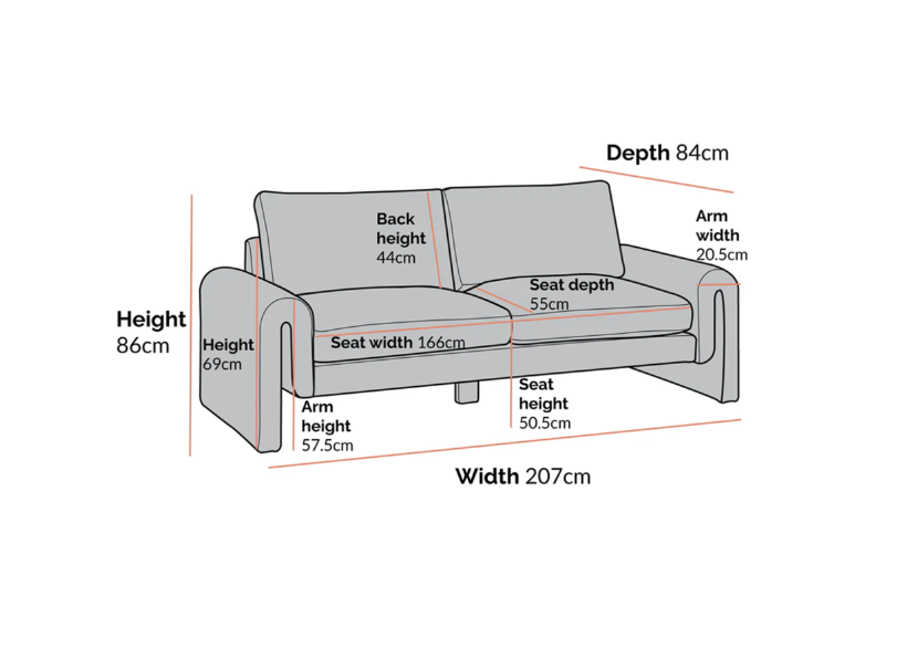 - Dimensions: W 207 x D 84 x H 86 cm. Seat height: 50.5 cm.