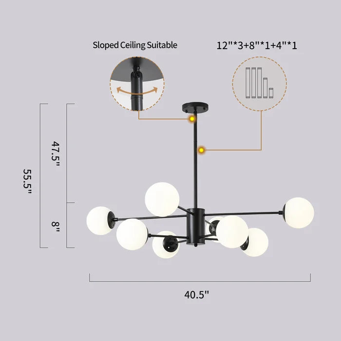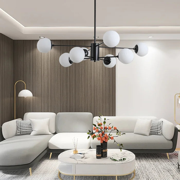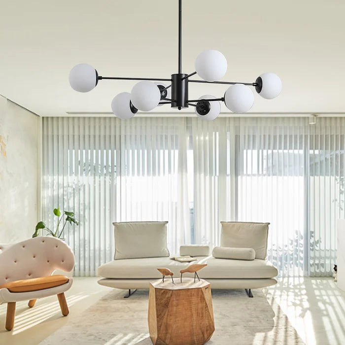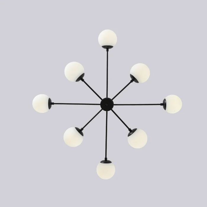 Modern ceiling lamp. Made of Steel with black electrostatic painting, It includes 8 sockets, 8 opal glass balls, without lamps.
