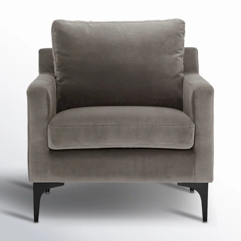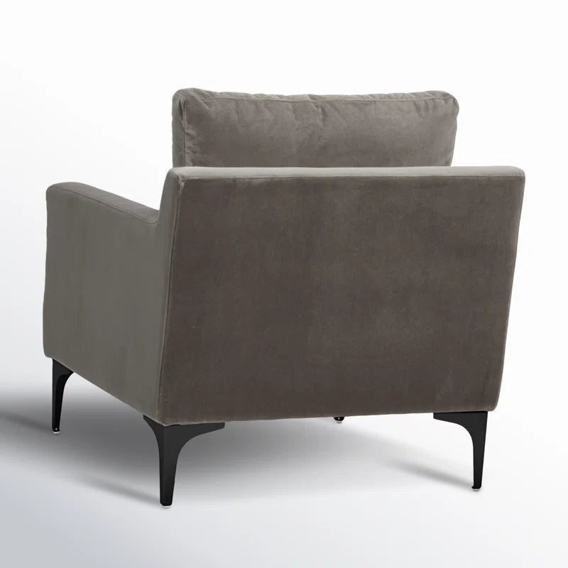 Experience ultimate comfort and style with the Jones Armchair. Its sleek design features contoured track arms and contrasting metal bracket feet for a modern touch. Enjoy a comfortable and approachable seating experience with this statement piece.