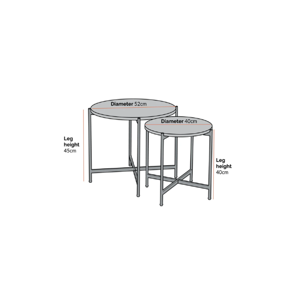 - Dimensions: : W 52 x D 52 x H 45 cm (large table), W 40 x D 40 x H 40 cm (small table).
