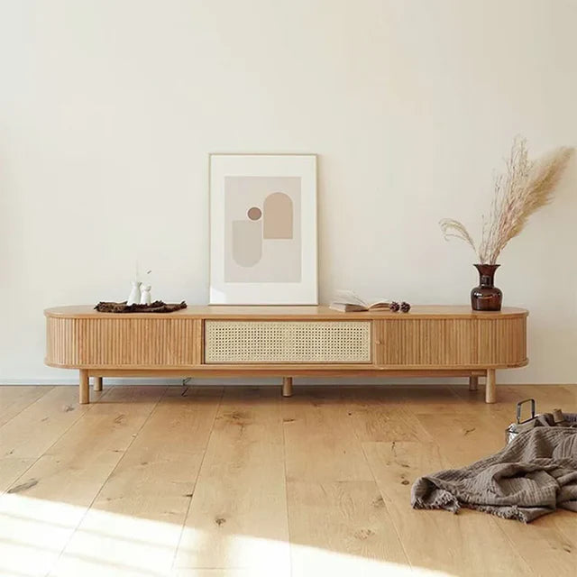 Elevate your living room with the luxurious, boho-chic Lyric cabinet. Made from solid oak wood, this TV stand features a unique rattan theater design, adding a touch of bohemian flair. Not just a TV stand, the Lyric is a statement piece that combines function and style, making it the perfect addition to your home decor.