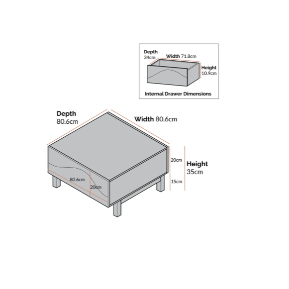 - Dimensions: W 80.6 x D 80.6 x H 35 cm.