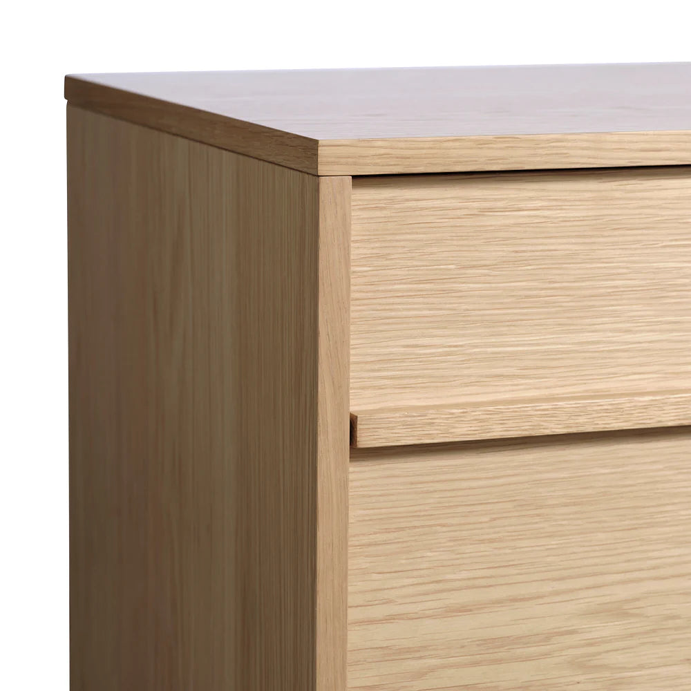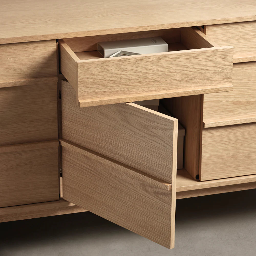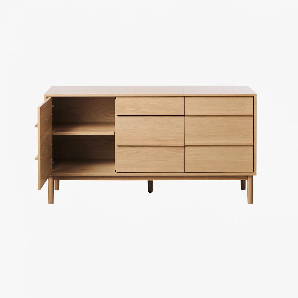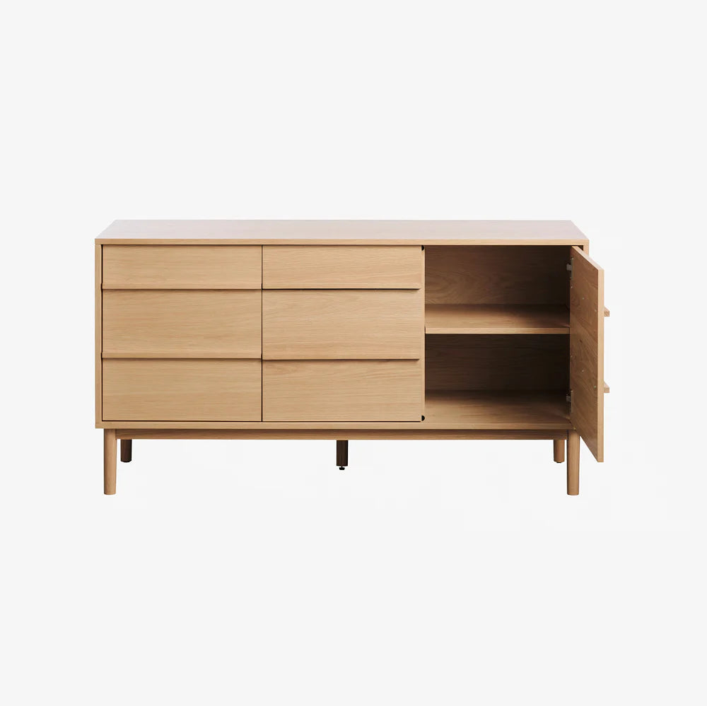 Introducing the Kai storage chest - a luxurious addition to any modern décor. Crafted with industrial wood and sleek oak veneer, this dresser boasts 3 spacious storage doors and a convenient single drawer, complete with elegant wooden handles. Solid wood legs ensure sturdiness for years to come. Elevate your space with the Kai.