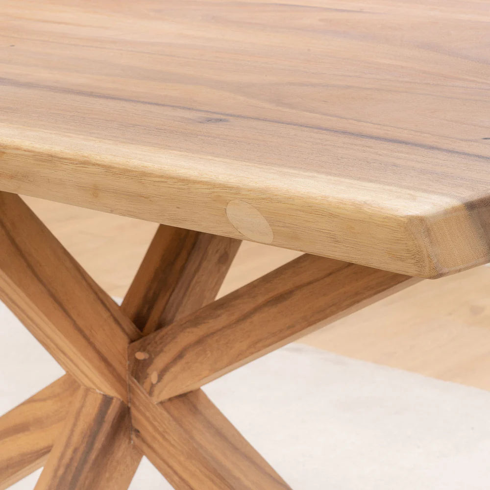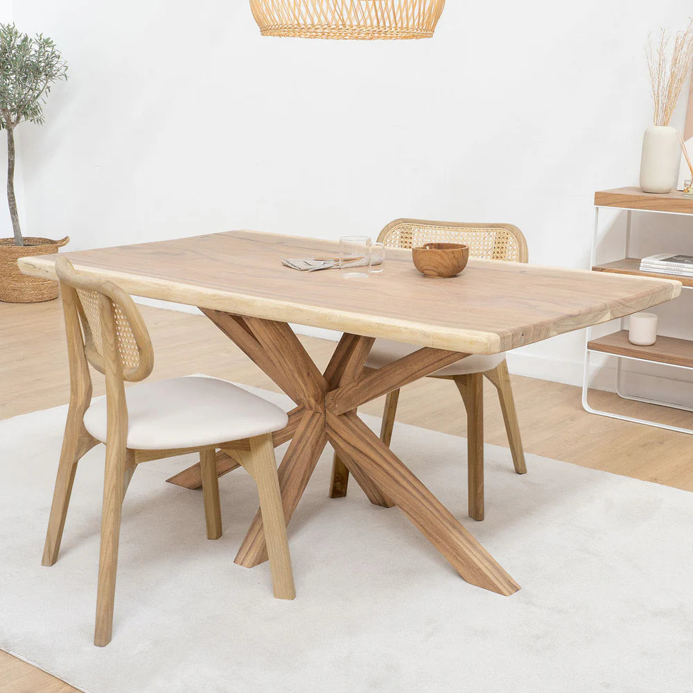 Upgrade your dining room with our PACK NATURA TABLE + 4 DARI CHAIRS set. Crafted from solid Trembesí wood, the Natura table adds a touch of elegance. Paired with the sleek and simple Dari chairs, this set is perfect for creating a warm and inviting atmosphere for your meals.