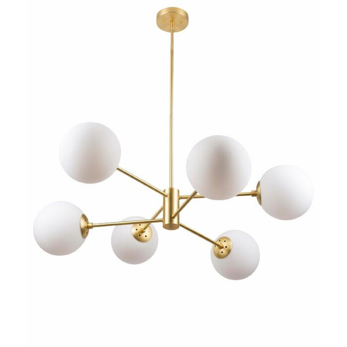 modern ceiling lamp. Made of Steel with gold Korean painting, It includes 6 sockets, and 6 opal glass balls, without lamps.