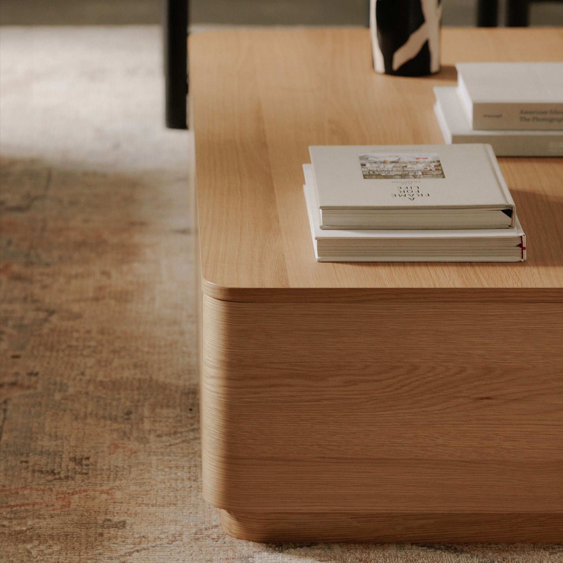 Elevate your living space with our Rina Curved Oak Pedestal Coffee Table. Made with a solid rubberwood frame and base, this table boasts added durability from its kiln-dried wood. The walnut or oak veneer lends a sleek look to the engineered wood top and drawers, making it a stylish and sturdy addition to your home.