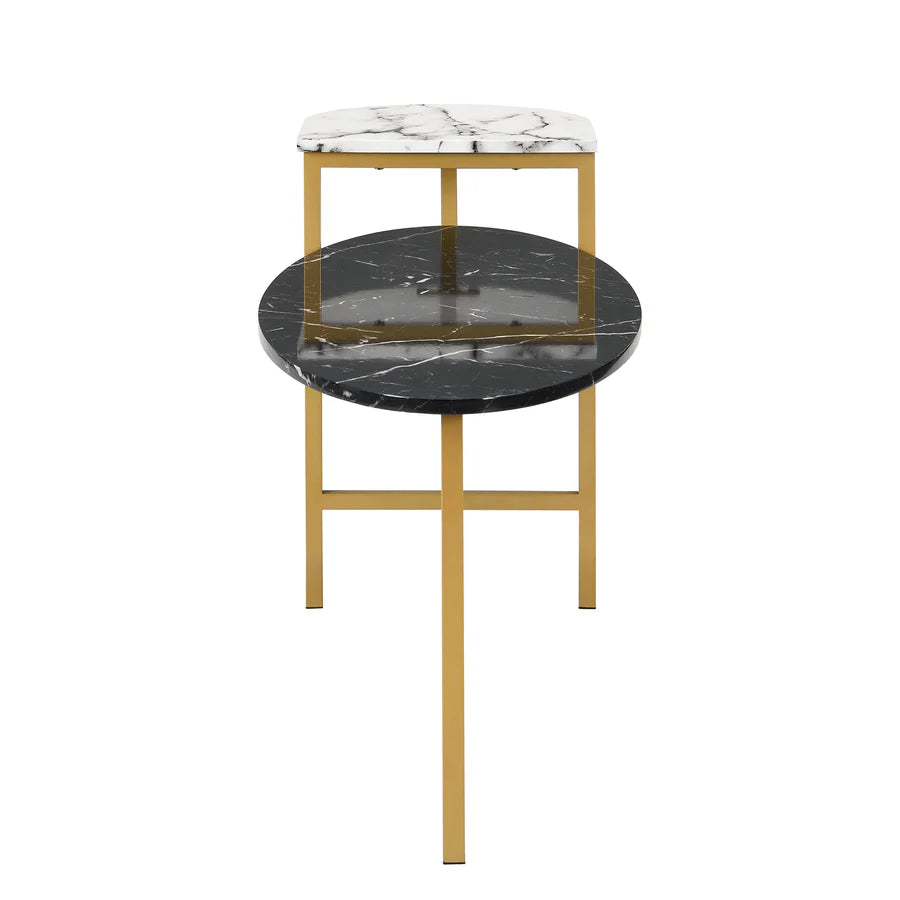Elevate your living space with our Sarina coffee table. Featuring a sleek minimalist design, its contrasting black and white marble effect top rests upon a painted gold steel frame. The elevated half-oval white piece adds a unique touch. Experience the perfect blend of style and function.
