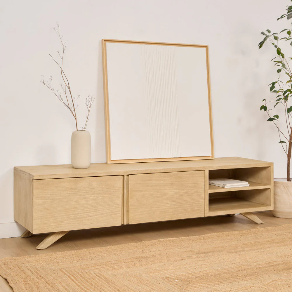 Upgrade your living room with the stylish Skan TV stand. Crafted from durable Sungkai wood, this rustic cabinet offers both functionality and design. With two spacious storage cabinets and two open shelves, it's perfect for storing all your media essentials and displaying your favourite decor. Elevate your space with Skan!